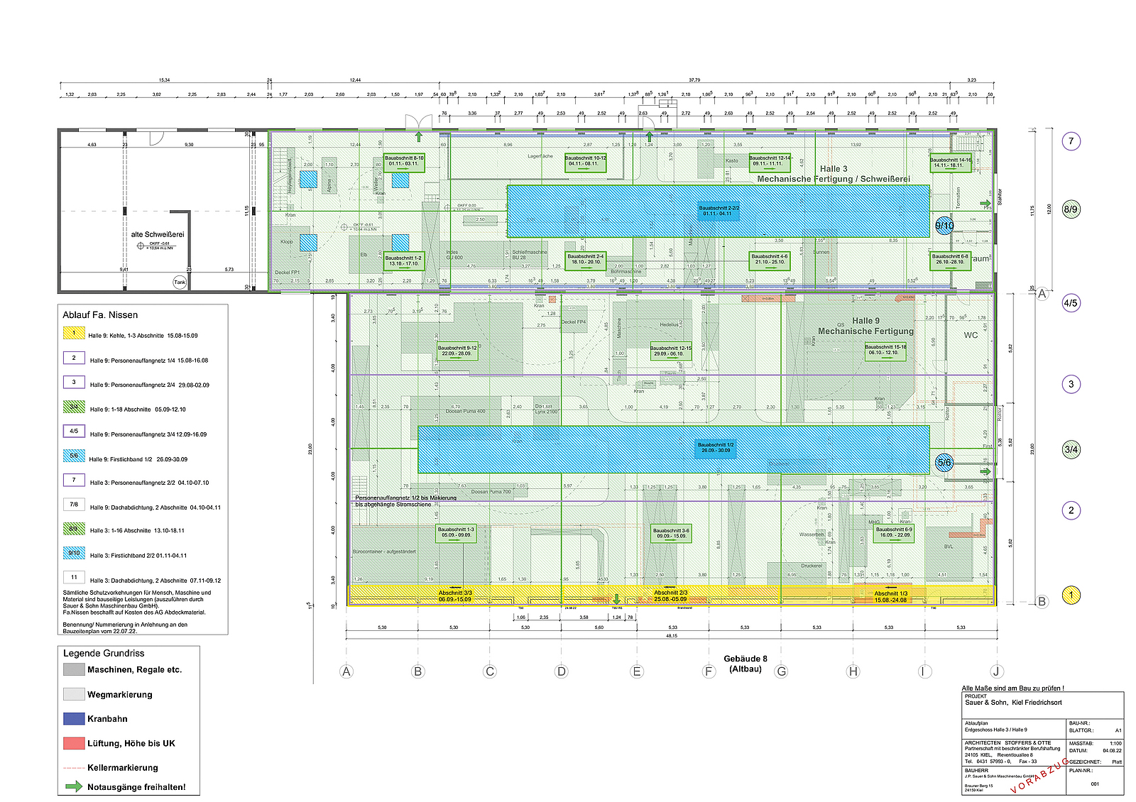 Im Vorfeld der Dachsanierung wurde durch das Dachdeckerunternehmen ein Bauzeitenplan vorgelegt, der vom Architekturbüro Stoffers & Otte in einen Bauablaufplan überführt worden ist. In diesem Ablaufplan ist die feldweise Sanierung der Bestandsdächer grafisch dargestellt. Für den Auftraggeber war es sehr wichtig zu wissen, zu welchem Zeitpunkt Maschinen stillgelegt und Arbeitsprozesse an einen anderen Ort verlegt werden müssen. Somit konnte rechtzeitig – im Vorfeld der Sanierungsarbeiten – die Forderung von Thalke Thormählen, der Sicherheits- und Gesundheitskoordinatorin der ibag, erfüllt werden, dass keine Arbeiten über- bzw. untereinander ausgeführt werden.