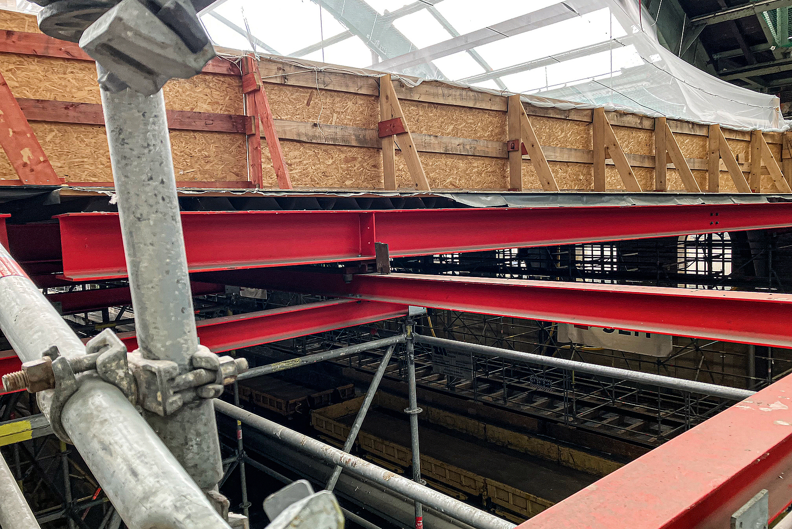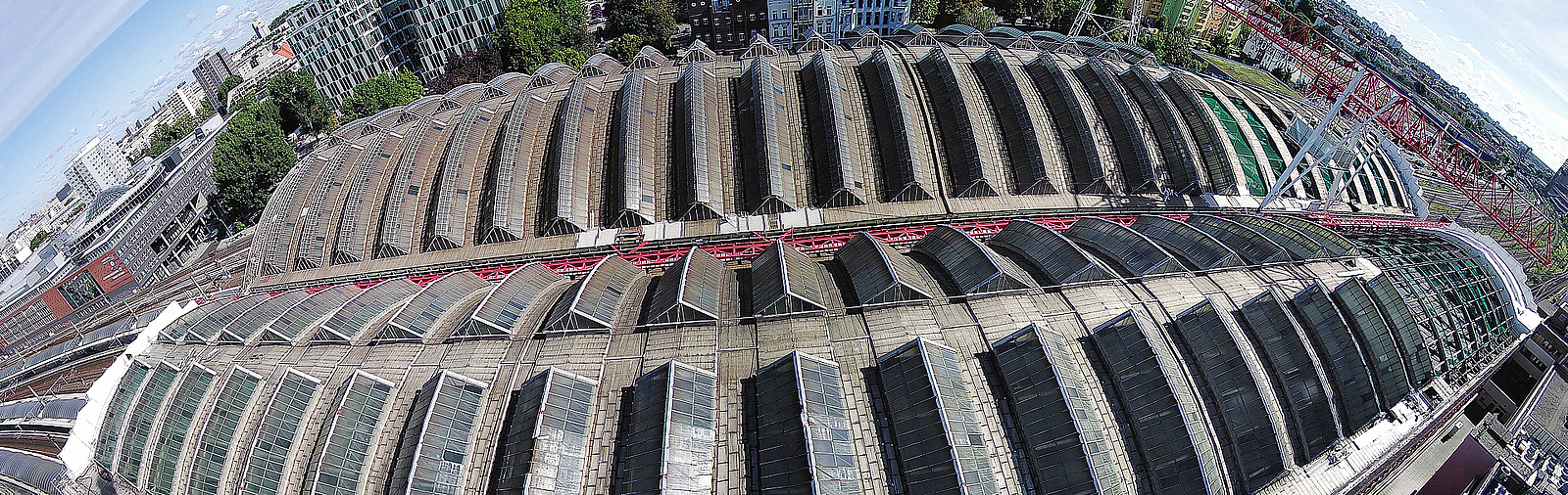 Für die Durchführung der Sanierungsarbeiten an den Hallendächern nutzt man eine spezielle Schutzbrücke, mit der bei laufendem Betrieb Stahlteile und Glasscheiben transportiert und eingebaut werden können.