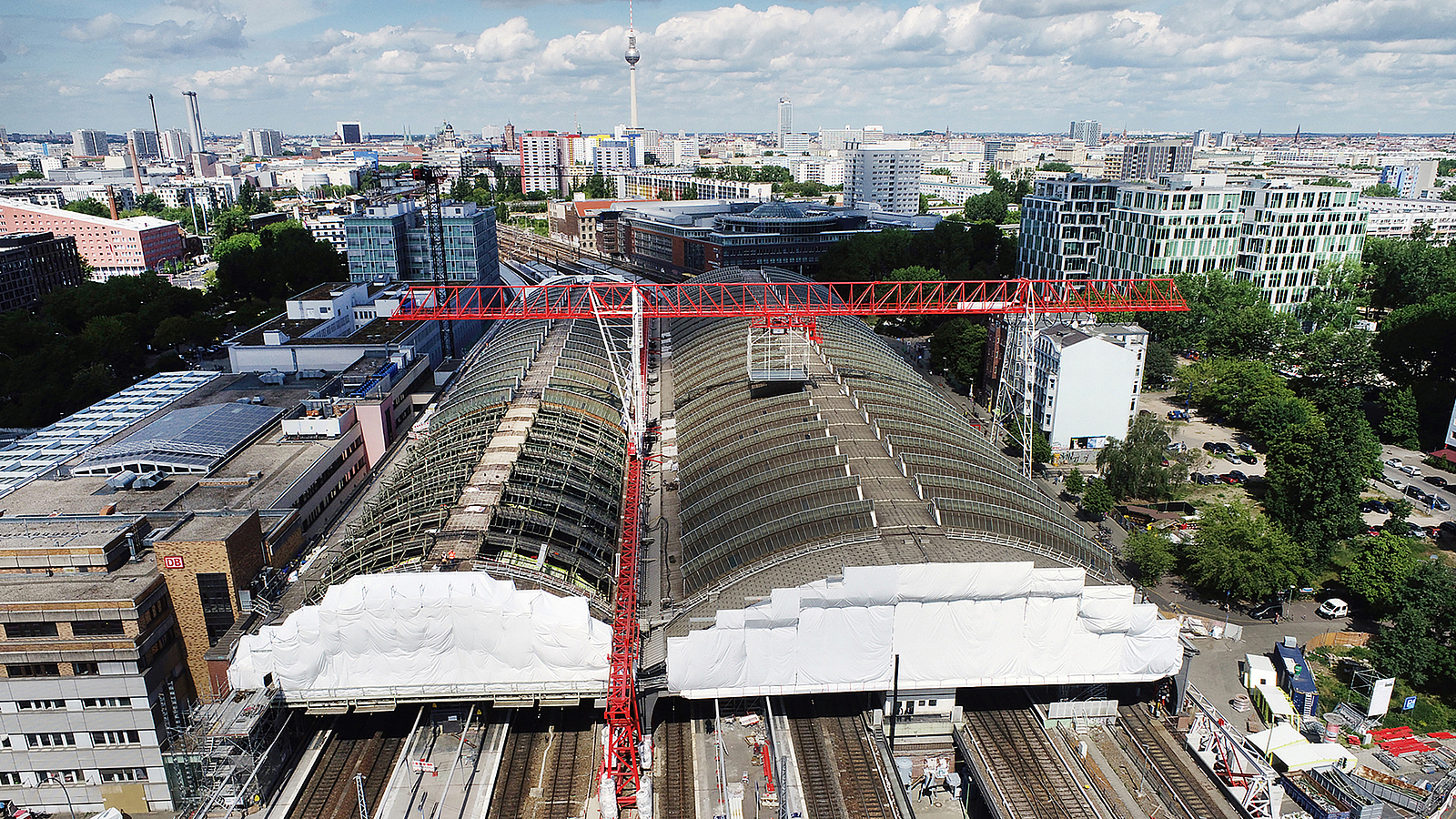 Die beiden rund 100 Jahre alten Gleishallen des Berliner Ostbahnhofs werden bis 2025 bei laufendem Betrieb von Grund auf modernisiert. Derzeit läuft der 2. Bauabschnitt. In diesem werden unter anderem die Bogenbinder instandgesetzt, die Giebelseiten der Gleishallen werden neu verglast und das Dach erhält eine metallische Verkleidung mit neuen Oberlichtern. Um die Bauarbeiten bei laufendem Bahnbetrieb zu gewährleisten, wurde eine sogenannte Schutzbrücke mit integriertem Hebezeug errichtet. Die Brückenkonstruktion überspannt beide Hallendächer und gewährleistet die Zulieferung der benötigten Baumaterialien.