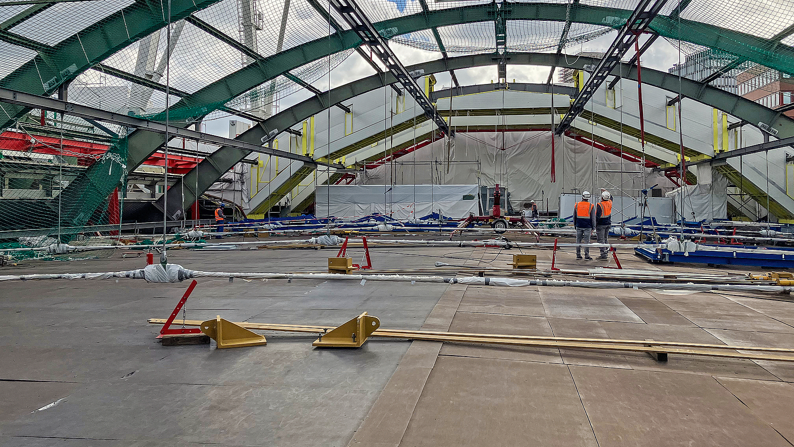 Auf der Schutz- und Arbeitsplattform finden auch die Strahl- und Korrosionsarbeiten an den Bogenbindern statt.
