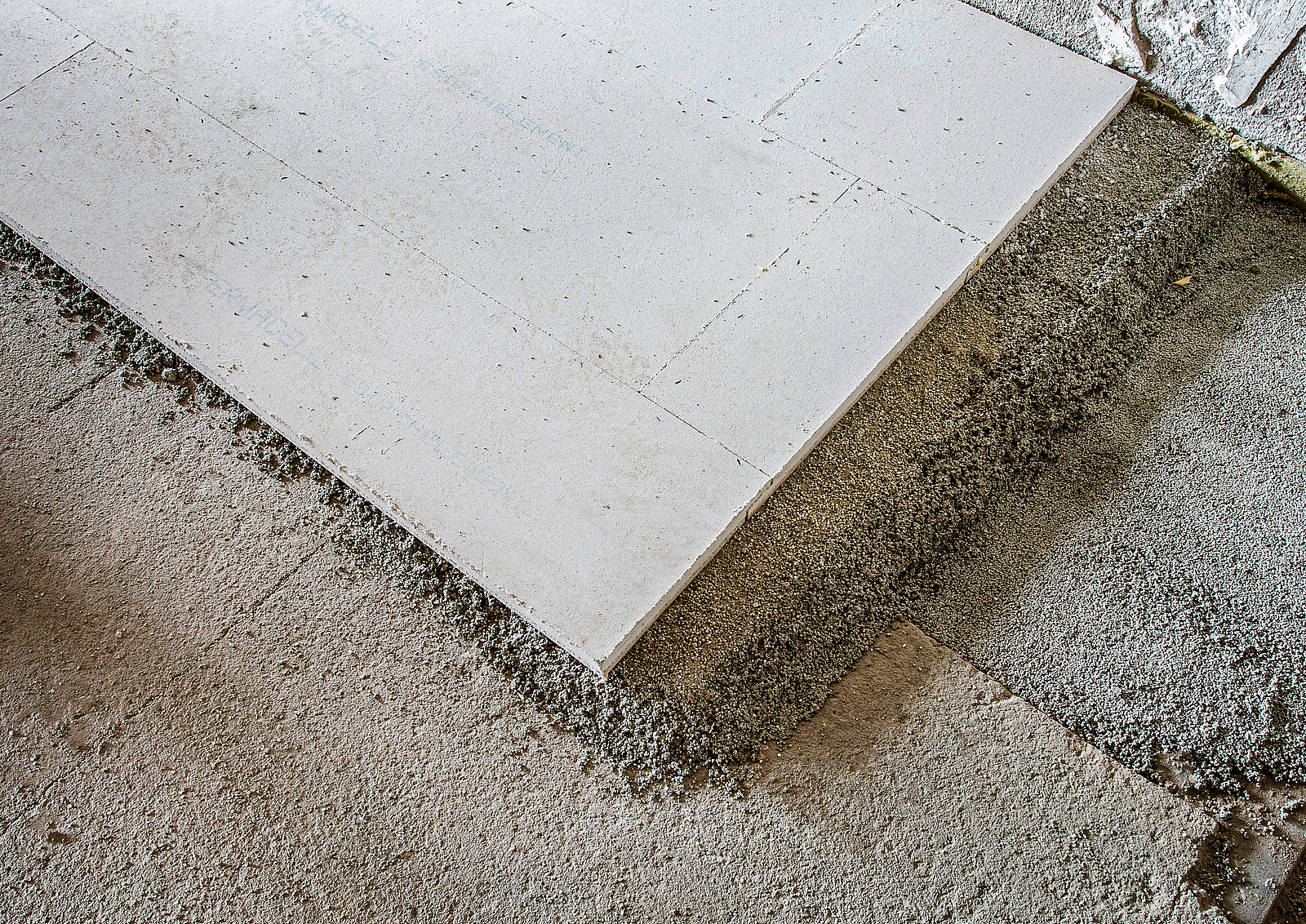 Vor der Verarbeitung der Estrich-Elemente wurden zunächst die Unebenheiten im Untergrund ausgeglichen. Dies geschah wegen der stark variierenden Höhenunterschiede der alten Deckenkonstruktion mit einer gebundenen Schüttung von fermacell®, die bereits für reduzierte Schütthöhen ab 10 mm bis zu einer maximalen Höhe von 2.000 mm geeignet ist. Sie besteht aus recyceltem Schaumkunststoff und einem zementären Bindemittel. Dabei sorgt der Schaumkunststoff neben guter Wärmedämmung für ein geringes Gewicht. Dank des schnellen Abbindeprozesses ist diese gebundene Schüttung nach zwölf Stunden begehbar und bereits nach 24 Stunden belegreif. Gleichzeitig verhindert das zementäre Bindemittel eine Setzung der Schüttung. Hinzu kommt eine hohe Wasserunempfindlichkeit, die eine Anwendung in Nassbereichen möglich macht. Das Material ist nicht brennbar und entspricht der Baustoffklasse A2-s1, d0.
