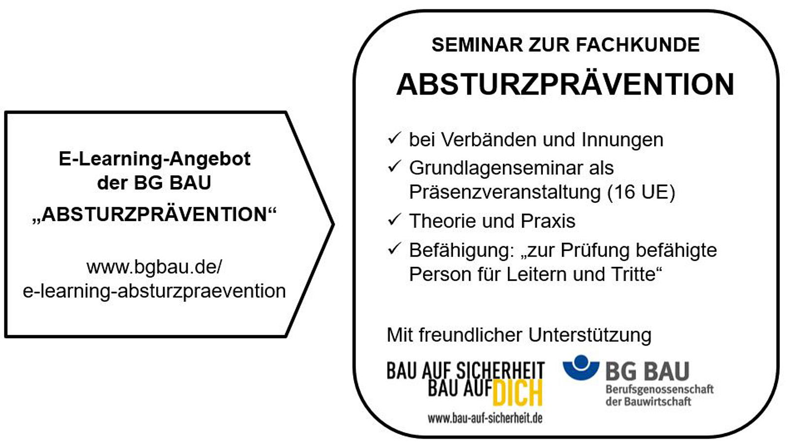 In diesen Seminaren sensibilisiert die BG BAU Teilnehmende für das Thema Absturz bei Bauarbeiten. Die Seminare informieren zu innovativen, praxisnahen Lösungen und modernen Arbeitsmitteln und vermitteln zudem praxisnahe Kenntnisse, um bspw. Prüfungen als eine „zur Prüfung befähigte Person für Leitern und Tritte“ nach Beauftragung durch den Arbeitgeber regelmäßig durchführen zu können.