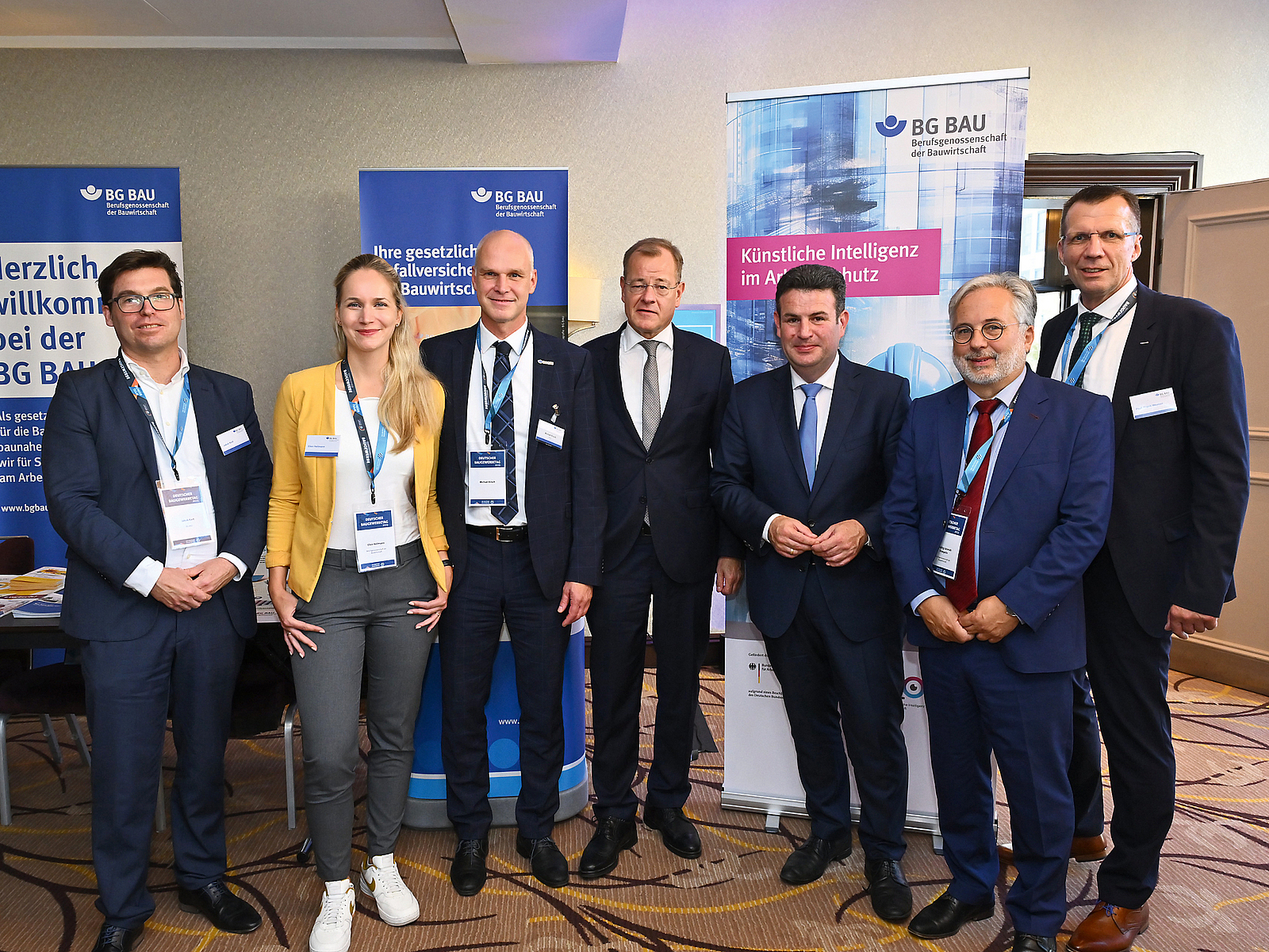 Hubertus Heil (3. v. r.) MdB, Bundesminister für Arbeit und Soziales, und Felix Pakleppa (4. v. r.), Hauptgeschäftsführer Zentralverband Deutsches Baugewerbe, informierten sich über das KI-Projekt der BG BAU.
