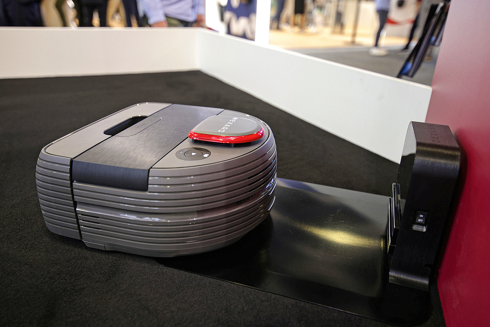 Beim „ADLATUS SR 1300“ von Adlatus Robotics erleichtert eine Service-Station die Arbeit, denn der Reinigungsroboter entleert dort den aufgekehrten Abfall und lädt auch seine Akkus selbstständig auf. In 24 Stunden soll der Roboter bis 45.000 m² kehren.