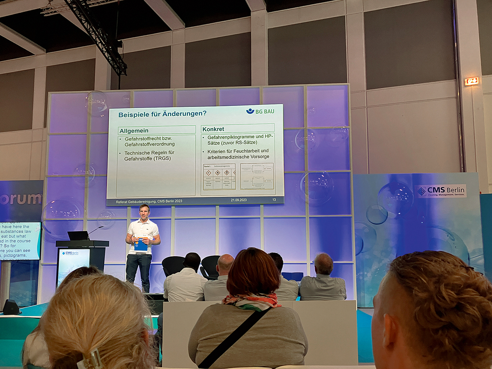 Auf dem Messegelände unter dem Berliner Funkturm fand vom 19. bis 22. September 2023 die diesjährige internationale Reinigungsfachmesse „Cleaning. Management. Services.“ – kurz CMS – statt. Mehr als 400 Aussteller präsentierten auf mehr als 31.000 m² Hallen- und Freigeländefläche ihre Produkte und Dienstleistungen. Auch die BG BAU war mit einem Messestand vertreten und beteiligte sich mit drei Vorträgen am Rahmenprogramm „CMS Praxisforum“.
