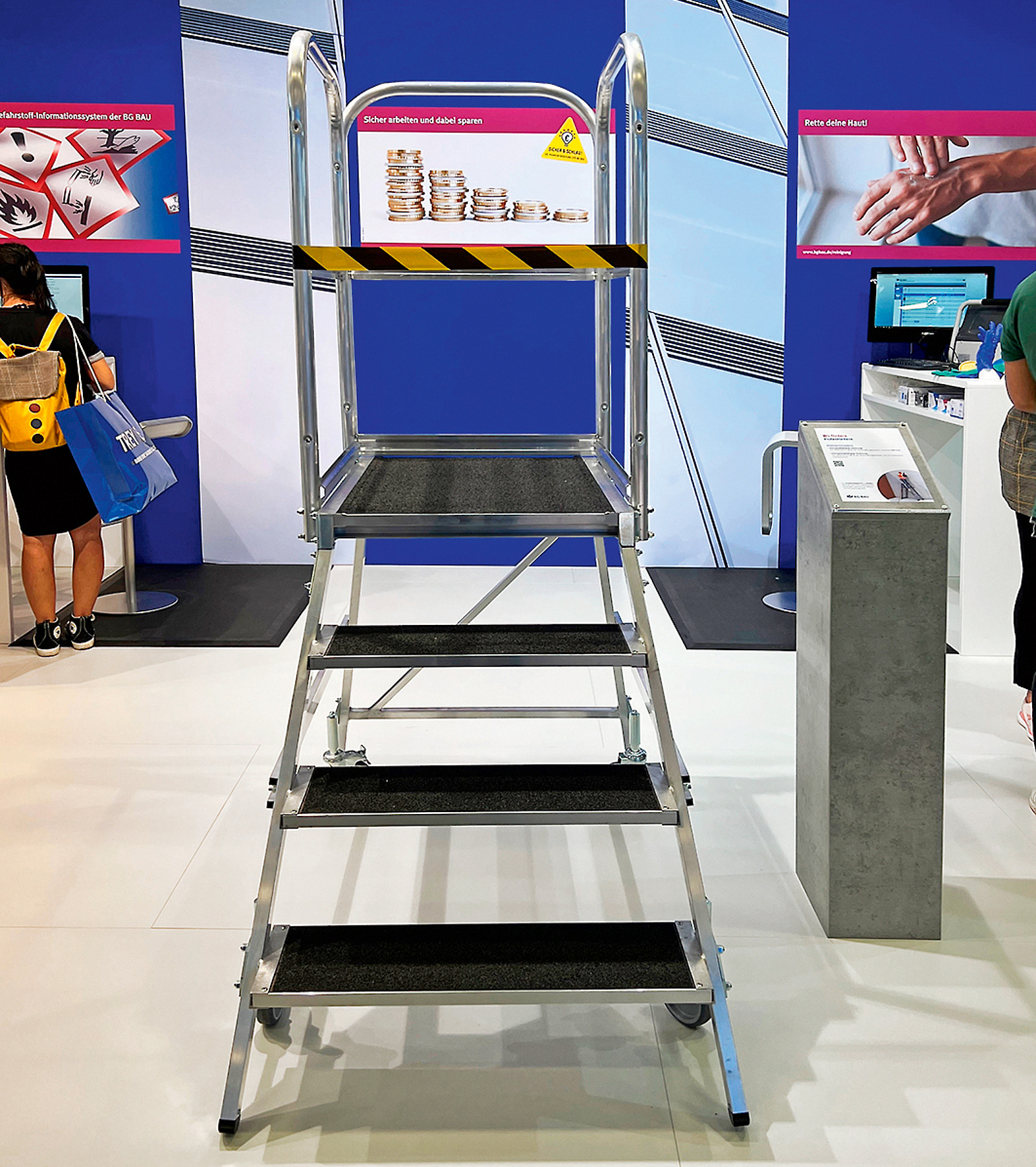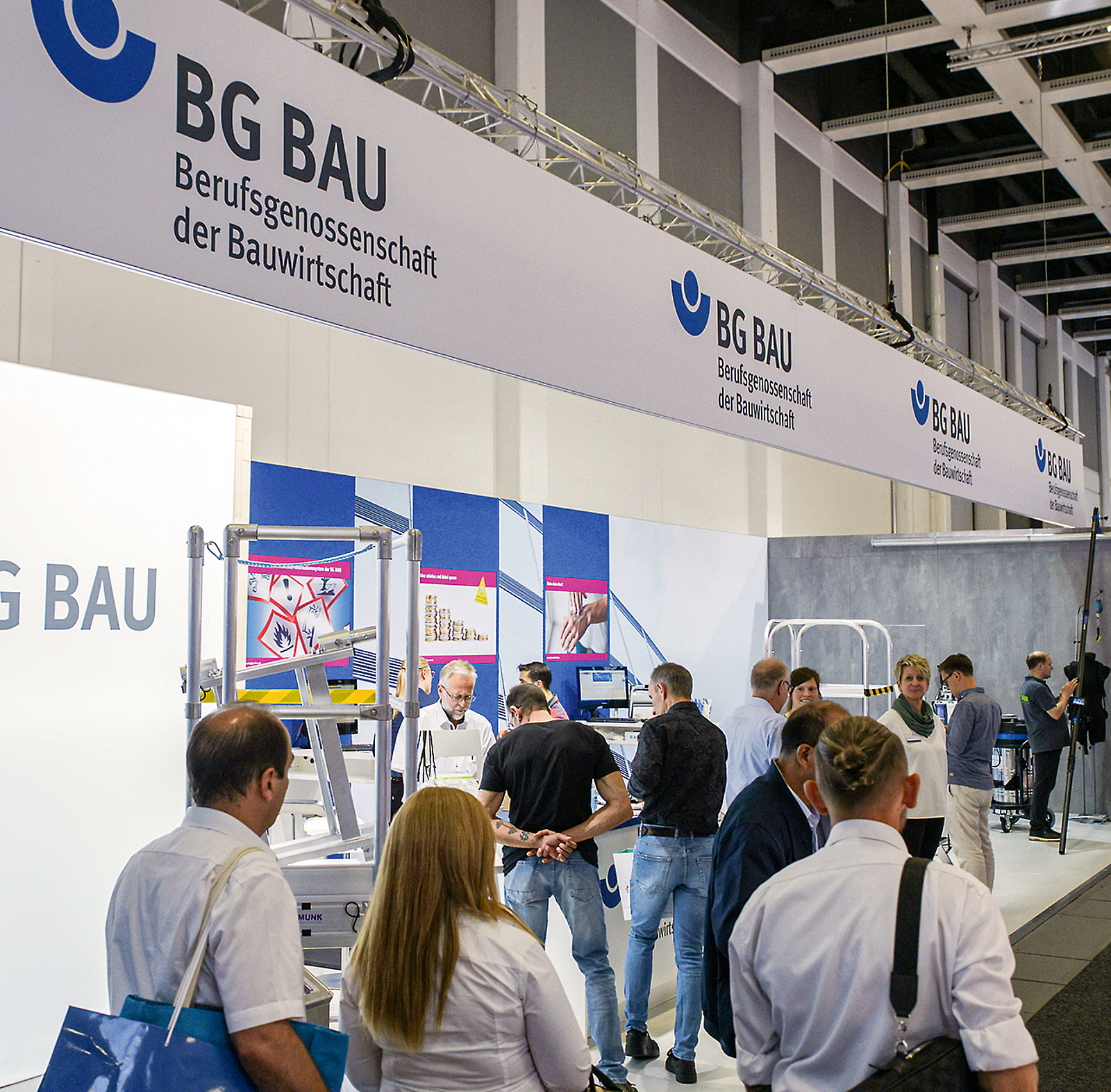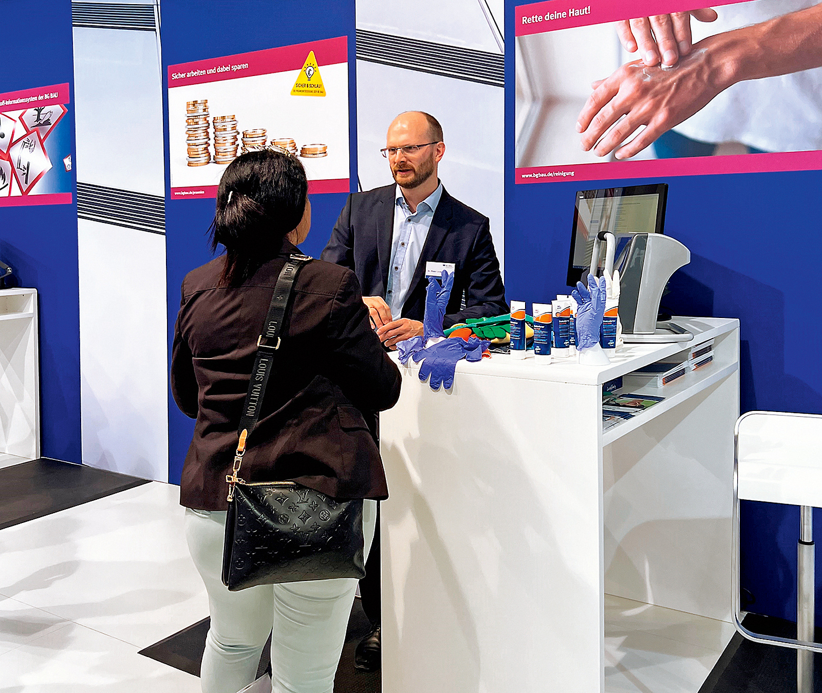 Etwa ein Drittel der mehr als drei Millionen Versicherten der BG BAU arbeitet im Reinigungsgewerbe und ist in der Raum-, Gebäude-, Fenster- oder Industriereinigung tätig. Aus diesem Grund war auch die BG BAU mit einem 70 m² großen Messestand auf der CMS vertreten und informierte zu den Themen Absturz, Gefahrstoffe und Hautschutz.