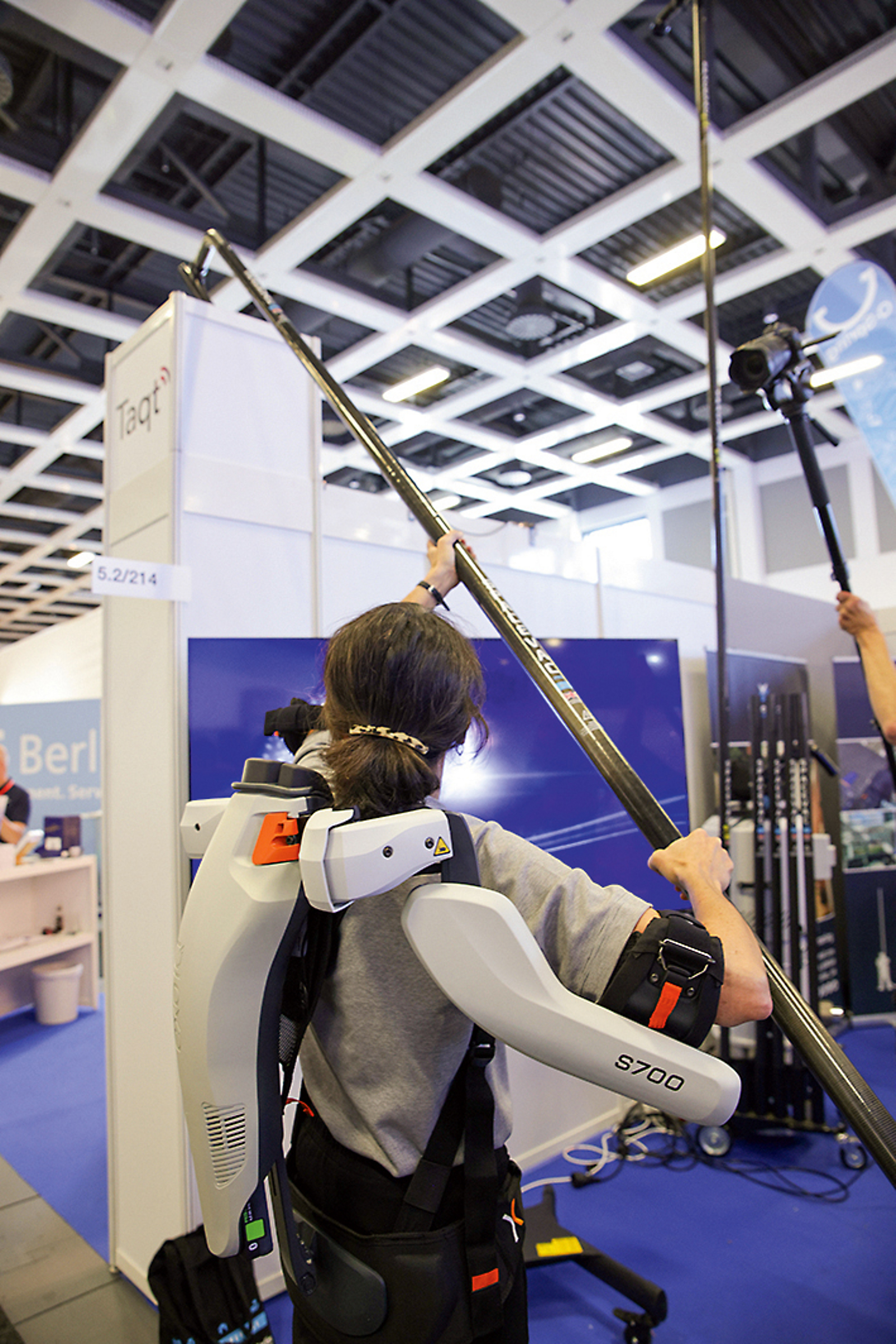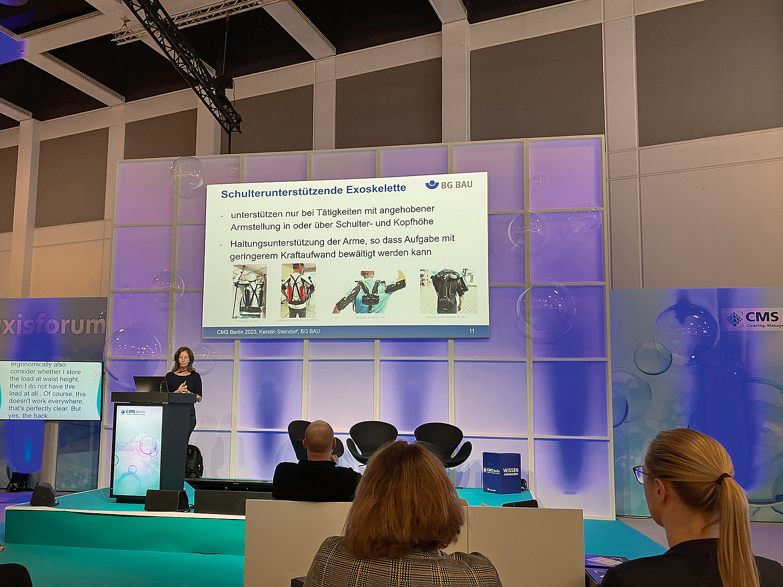 Im dritten Vortrag fasste Kerstin Steindorf vom Referat Ergonomie zusammen, was man zu Exoskeletten wissen sollte und wie deren Einsatz im Reinigungssektor zu beurteilen ist. Grundsätzlich können Exoskelette eine Lösung für die Reduzierung der Belastungen bei bestimmten körperlich anstrengenden Tätigkeiten sein – vor allem bei längeren, wiederkehrenden Arbeiten über Kopf. Sie stabilisieren Rücken und Hüfte und können damit eventuell Fehlhaltungen vorbeugen. Allerdings gibt es bislang weder ein standardisiertes Verfahren zur Bewertung von Exoskeletten noch Studien zu möglichen Langzeitfolgen. Bisher wurden Exoskelette vornehmlich im Ausbaugewerbe praktisch getestet – jedoch nur nach firmeninternen Gesichtspunkten und nicht nach untereinander vergleichbaren Standards. Im Reinigungsgewerbe werden oft Teleskopstangen in Verbindung mit einem Rucksacksystem für die Glas- und Fassadenreinigung eingesetzt. Diese Systeme werden z. B. auch von der BG BAU als Arbeitsschutzprämie gefördert.