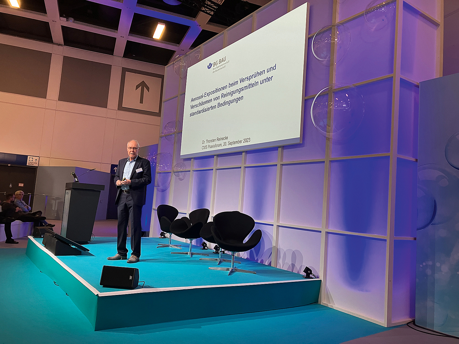 Dr. Thorsten Reinecke aus dem Referat Gefahrstoffe erläuterte die Ergebnisse einer Studie, die die Aerosol-Expositionen beim Versprühen und Verschäumen von Reinigungsmitteln unter standardisierten Bedingungen untersuchte. Michael Alexander Fritz vom Referat Gebäudereinigung stellte die aktualisierte DGUV Regel 101-019 „Umgang mit Reinigungs- und Pflegemitteln“ vor, die die Gefahrstoffverordnung und Technischen Regeln für Gefahrstoffe (TRGS) für die Umsetzung in der Praxis konkretisiert und Unternehmen bei der Erstellung der Gefährdungsbeurteilung unterstützt. Bei der Aktualisierung der DGUV Regel – vor allem bei der Darstellung geeigneter Schutzmaßnahmen – wurde das Wissen der langjährigen Präventionsarbeit berücksichtigt.