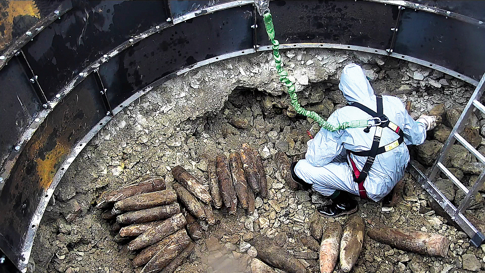 Vor ihrem ersten „richtigen“ Einsatz trainieren die Kampfmittelspezialisten mehrere Wochen ihren Einsatz in Ganzkörper-Schutzanzügen und Atemschutz. Für die Arbeit im sogenannten Vollschutz gelten spezielle Regelungen – u. a. eine Limitierung der zulässigen Arbeitszeit. Die Beschäftigten können nur 84 Minuten am Stück im Einsatz sein, bevor sie abgelöst werden müssen. Aus Sicherheitsgründen dürfen nur zwei Beschäftigte gleichzeitig in der Bergungshalle sein.