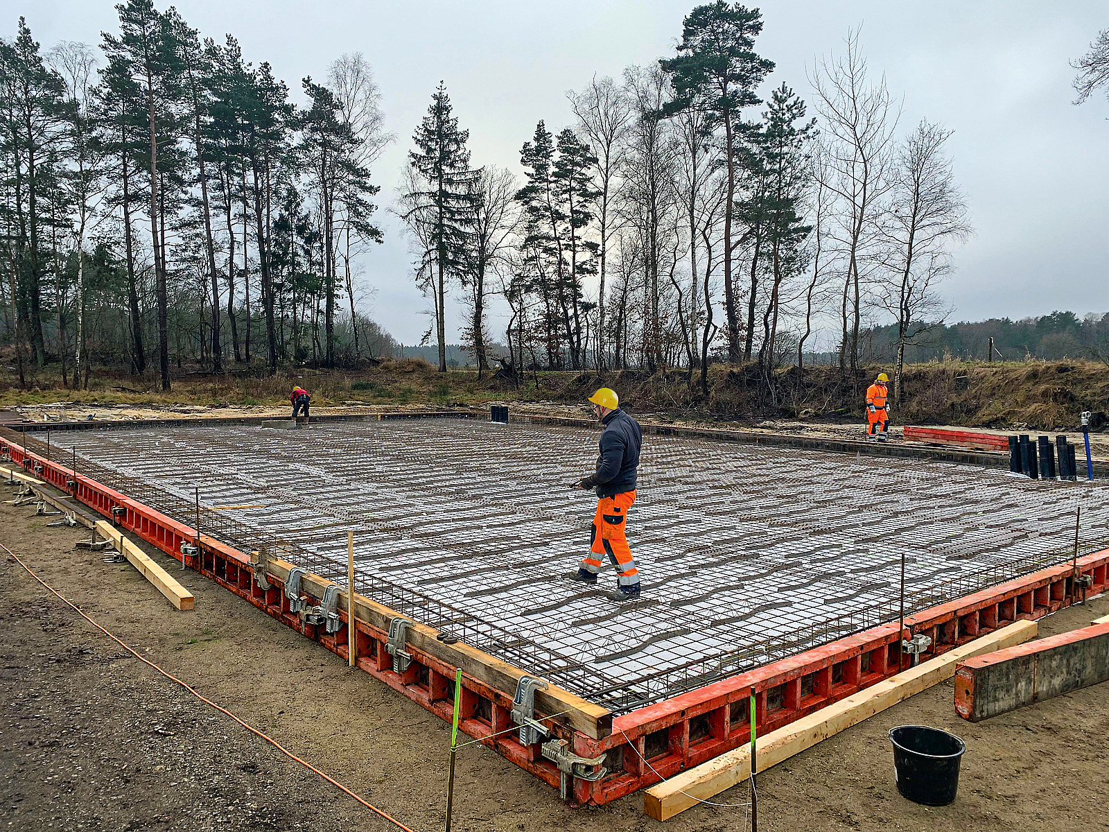 Die Erschließung der Baustelle mit Strom, Abwasser und Glasfaser wurde Ende 2021 durchgeführt. Damit die Altlasten des Teichs geborgen werden können, musste parallel das Grundwasser abgesenkt und dann gereinigt werden.
