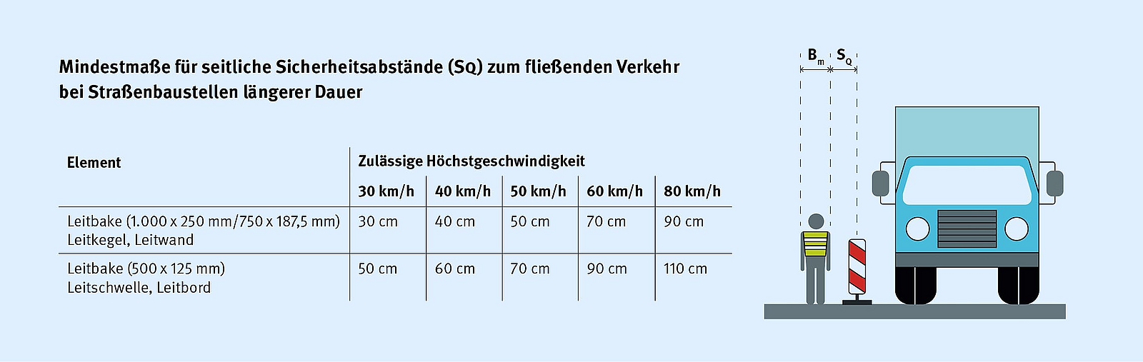 Grundsätzlich gilt: Der Generalunternehmer ist für die Herstellung der Sicherheit auf der Baustelle im Verhältnis zu den Arbeitnehmern des Subunternehmers verpflichtet, er haftet nach den Grundsätzen des Vertrages mit Schutzwirkung zu Gunsten Dritter (OLG Saarbrücken (8. Zivilsenat), Urteil vom 18.03.2010–8 U 3/09). Diese Verantwortlichkeit bezieht sich auf den Arbeitsstellenbereich. Erfüllt der Baustelleneinrichter also die Anforderungender ASR 5.2, kann er davon ausgehen, rechtskonform zuhandeln und seiner Verpflichtung nachzukommen. In der Praxis sind die Sicherheitsabstände zum fließenden Verkehr (SQ u. SL) und die Mindestmaße für die auszuführenden Tätigkeiten (BM) für die korrekte Einrichtung des Arbeitsstellenbereichs entscheidend.