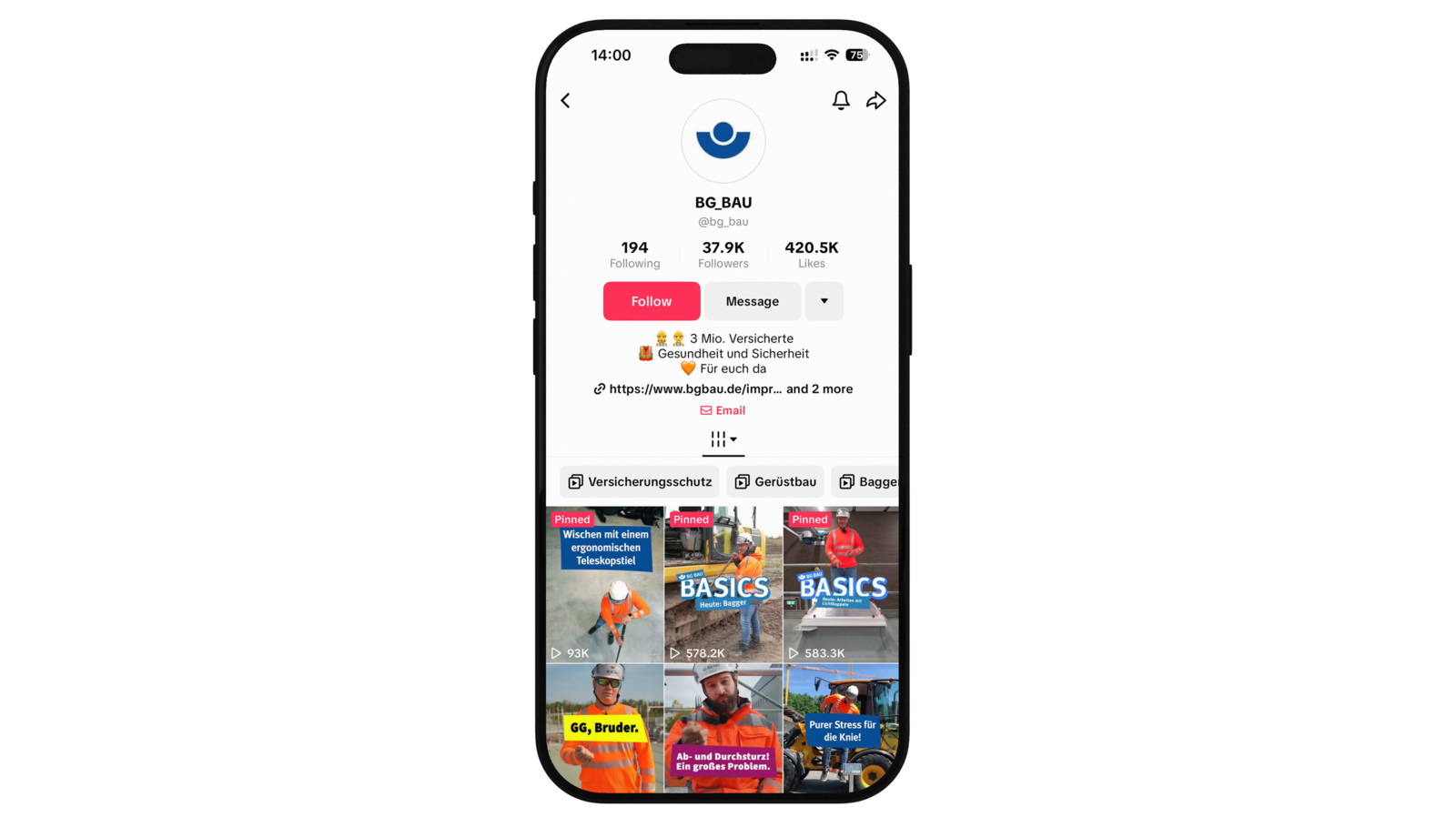 Seit April 2023 erscheint zweimal wöchentlich Content zum Arbeitsschutz in den unterschiedlichsten Gewerken auf dem TikTok-Kanal der BG BAU. Rund um den Kanal hat sich eine lebendige Community entwickelt, die Inhalte auch in ihren eigenen Netzwerken weiterleitet und so zusätzliche Aufmerksamkeit für wichtige Arbeitsschutzthemen schafft.
