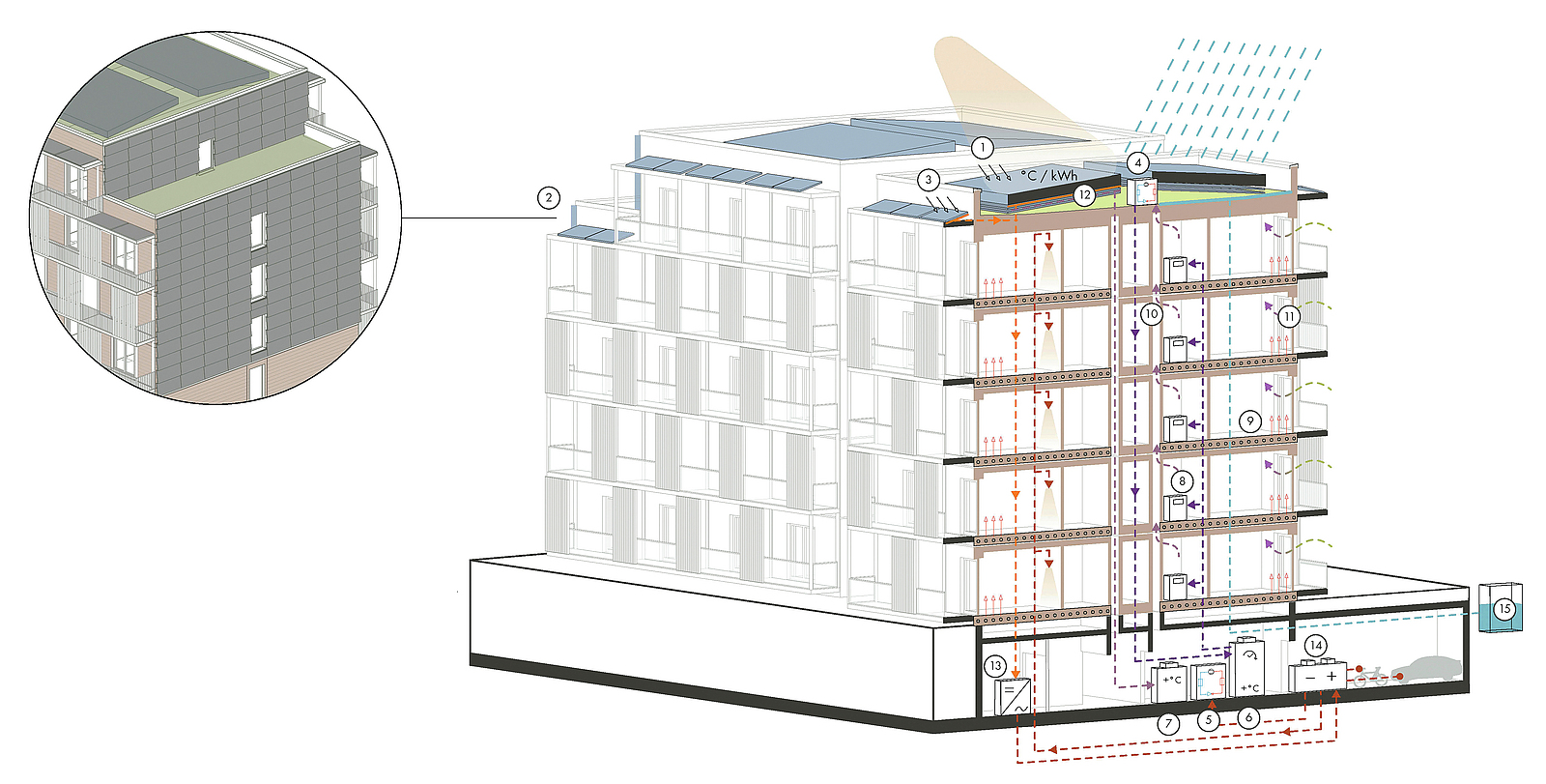 Die Elemente der Gebäudeausrüstung, die den Gebäudekomplex zum Plus-Energie-Quartier werden lassen.
