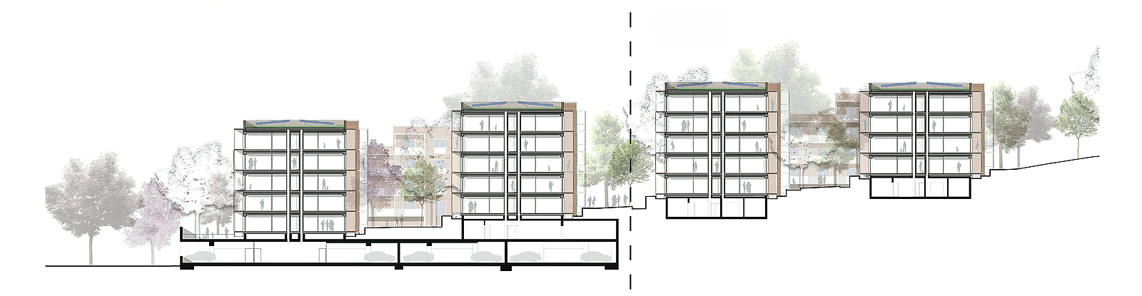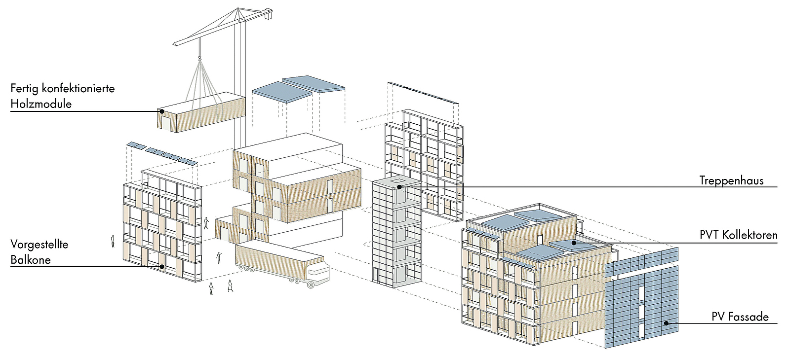 Das Projekt zeigt, wie ressourcenschonendes und energieeffizientes Bauen möglich ist: Durch die Vorfertigung der Module in Holzständerbauweise wurden gegenüber dem konventionellen Wohnungsbau 75 % Materialmasse eingespart. Auf das Gesamtvolumen des Bauprojekts bezogen bedeutet das in Zahlen, dass beispielsweise 5.500 m3 Beton mit einem CO2-Äquivalent von 1.815 t eingespart werden konnten – pro Modul etwa 26 m3. Der Materialmix besitzt ökologische wie ökonomische Vorzüge:
