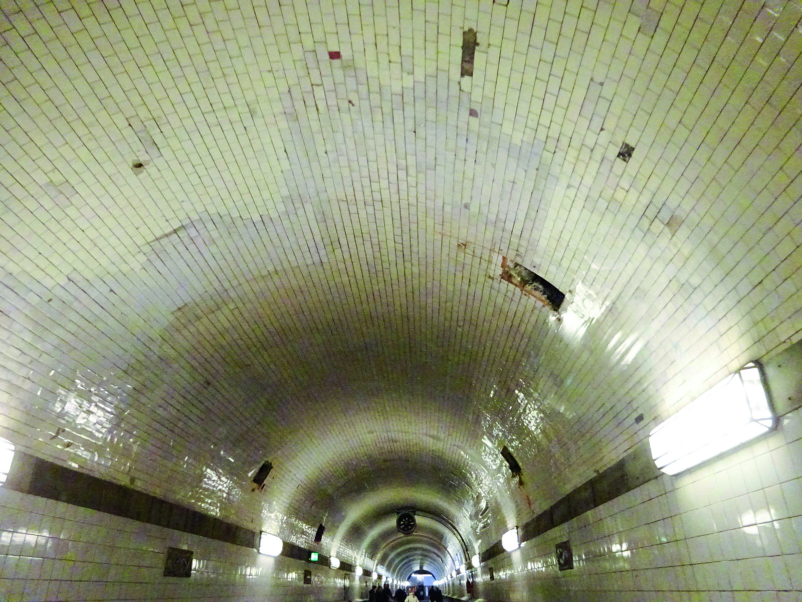 Zwei Treppen mit je 132 Stufen, vier hydraulisch betriebene Fahrkabinen für Fahrzeuge und zwei kleine Personenaufzüge führen 24 m in die Tiefe. Dort befindet sich der Eingang zu zwei hell gefliesten Röhren. Sie führen 426 m unter dem Wasser entlang nach Steinwerder auf die südliche Elbseite.