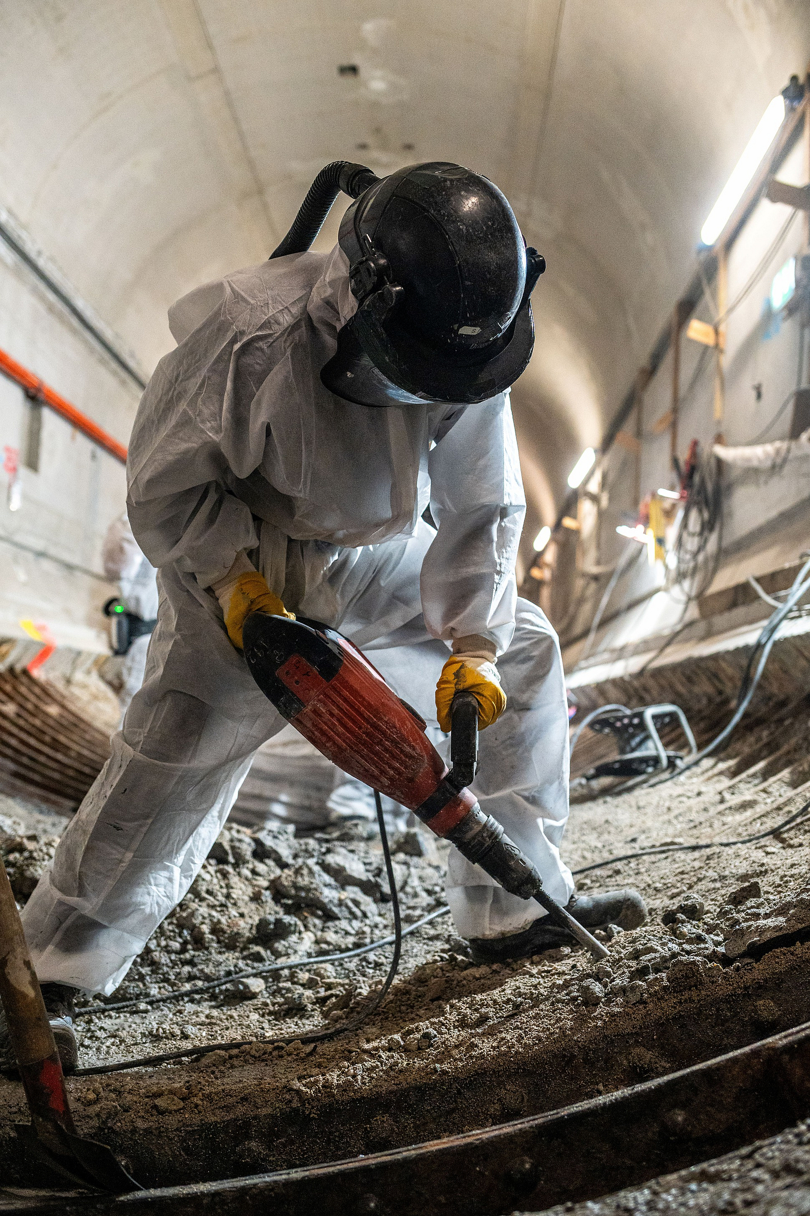 Sämtliche dieser Arbeiten waren wegen der hohen Belastung mit mineralischen Stäuben und Bleistäuben mit „Persönlicher Schutzausrüstung“ einschließlich Atemschutz auszuführen. Das heißt konkret, dass die Beschäftigten mit gebläseunterstützten Helmen mit Partikelfilter und Schutzanzügen Kategorie III Typ 5 sowie Nitrilhandschuhen gearbeitet haben. Darüber hinaus wurde auch die Tunnelröhre zu den Portalen hin durch temporäre Schleusenanlagen abgetrennt.