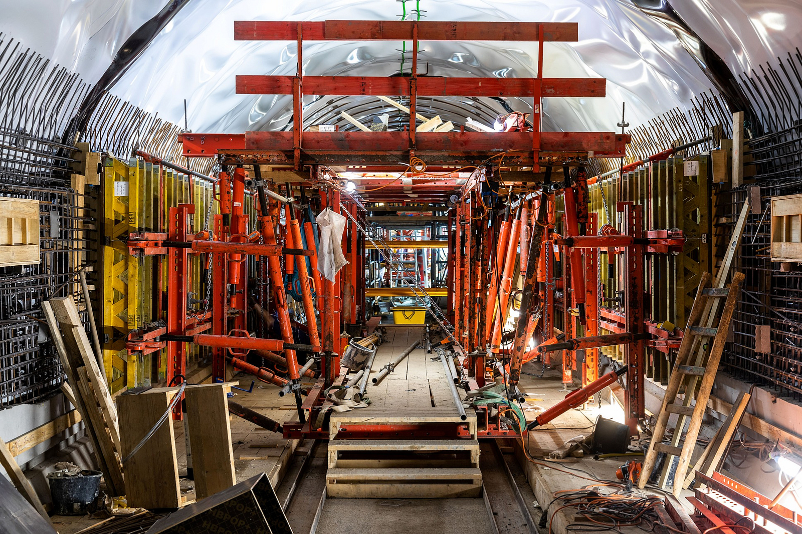 Als Schalungen für die Wand- und Gewölbebereiche werden Schalwagen eingesetzt, die an die sehr beengten Verhältnisse der Tunnelröhre mit nur rd. 5 m Innendurchmesser dahingehend angepasst wurden, dass neben den notwendigen Konstruktionen zur Aufnahme der Betonierlasten auch die erforderlichen Arbeits-, Pumpleitungs- und Fluchtwege vorhanden waren.
