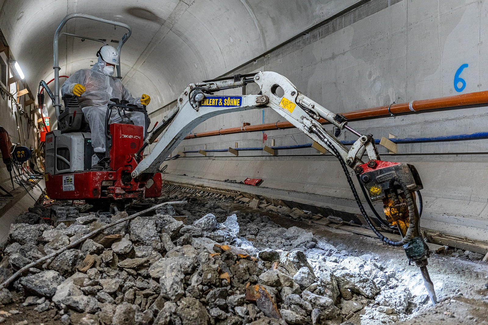 Zum Sanierungsumfang gehört auch die Sanierung des Fahrbahnblocks im unteren Tunnelbereich. Dafür muss zunächst auch hier die alte Fahrbahn abgebrochen werden, um die darunterliegenden Tübbings freizulegen.
