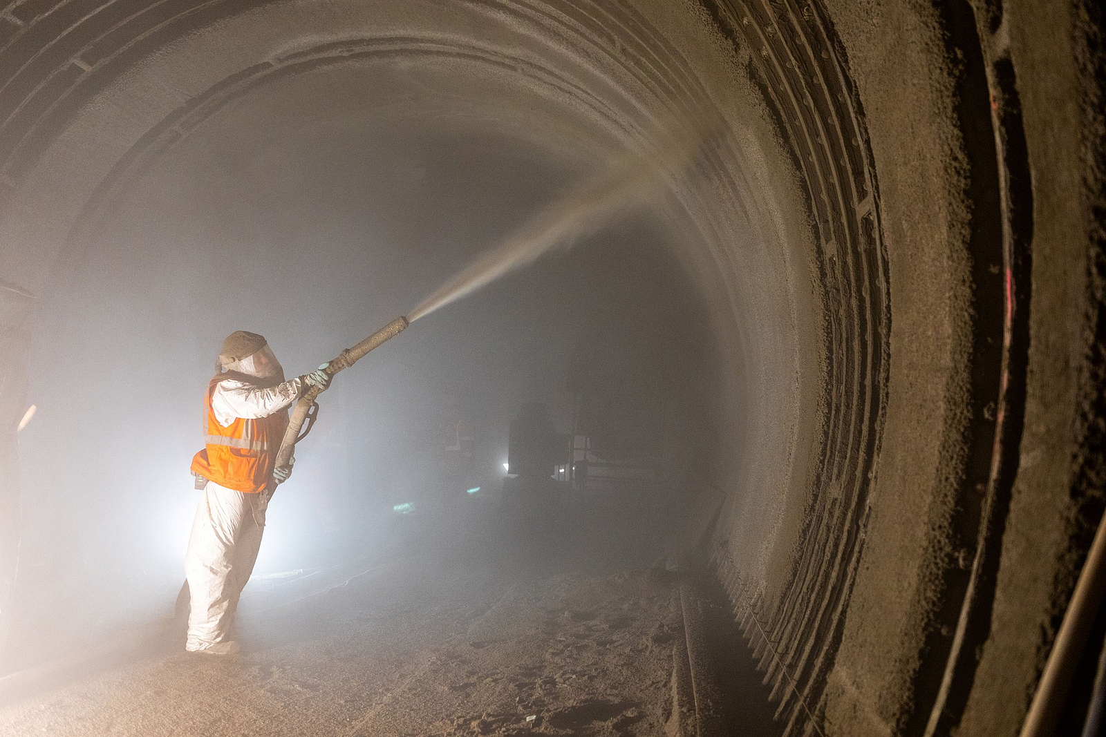 Nach Aufbringen einer Schutzbeschichtung sämtlicher Fugen und gründlicher Reinigung der Tübbingkonstruktion konnte der Schwarzbereich aufgehoben werden und die Weiterführung der anschließenden Arbeiten war im normalen Baustellenbetrieb möglich. Im nächsten Schritt wurden die Spritzbetonarbeiten im oberen Tunnelquerschnitt durchgeführt.