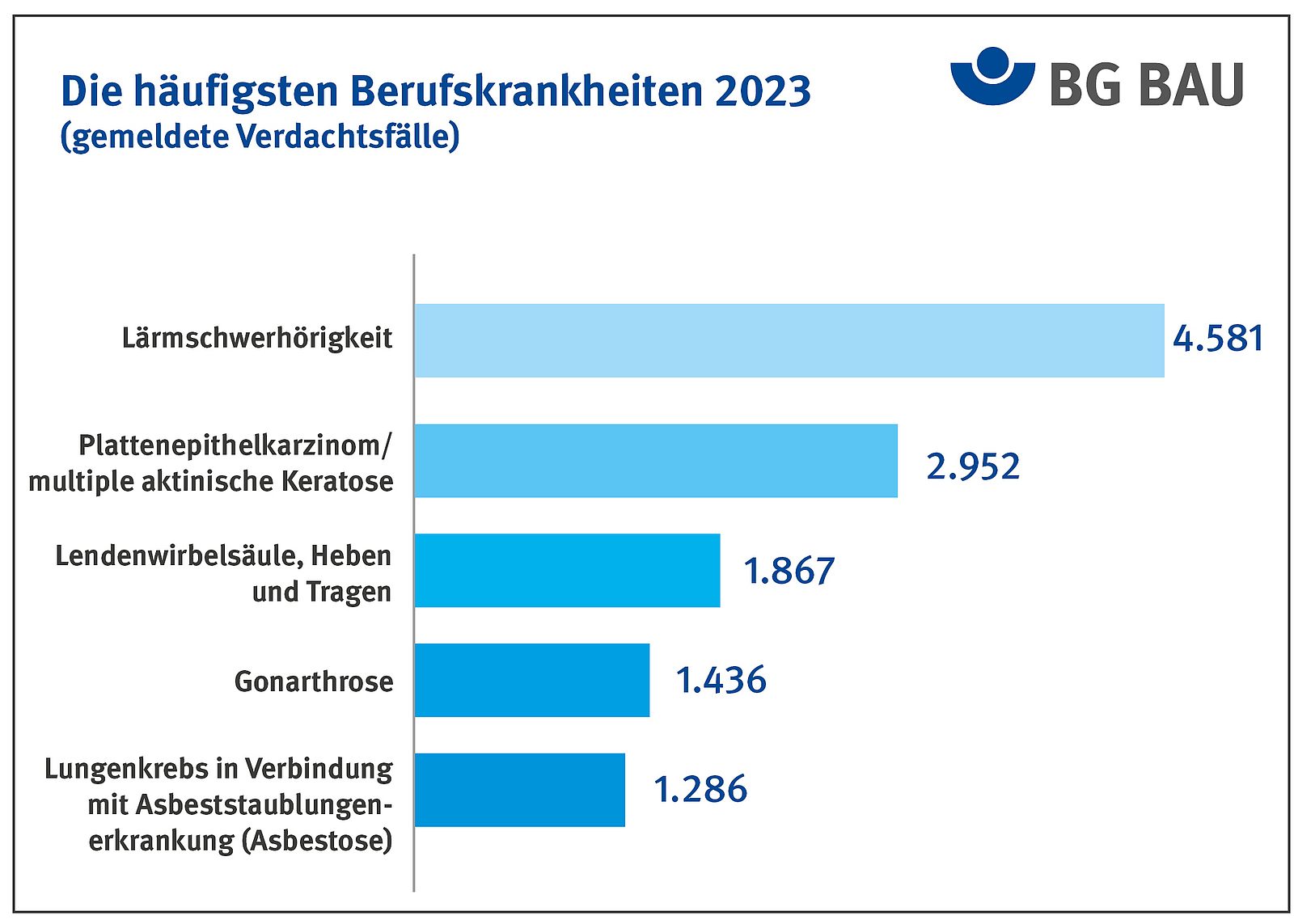 Die im Jahr 2023 am häufigsten gemeldeten Berufskrankheiten sind Lärmschwerhörigkeit (4.581), Hautkrebs durch die ultraviolette Strahlung der Sonne (2.952), band- scheibenbedingte Wirbelsäulenerkrankungen (1.867), Verschleißerkrankungen des Kniegelenkes (1.436) und Lungenkrebs in Verbindung mit einer Asbeststaublungenerkrankung (1.286).