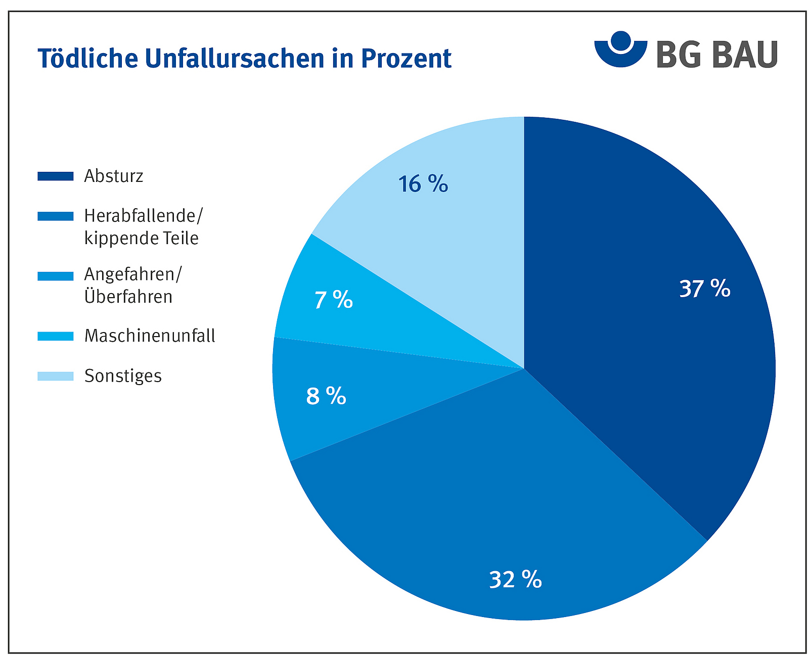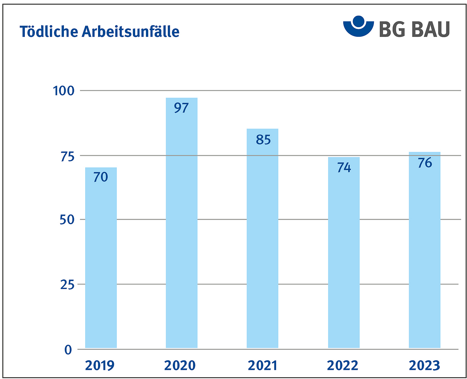 76 Beschäftigte sind 2023 bei einem Arbeitsunfall am Bau ums Leben gekommen. Das sind zwei Tote mehr als 2022. Die Hauptursachen sind Absturzunfälle sowie herabfallende oder kippende Bauteile. Beide Ursachen zusammen machen rund 70 % aller tödlichen Arbeitsunfälle am Bau aus.