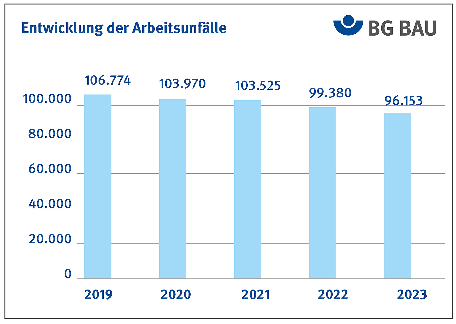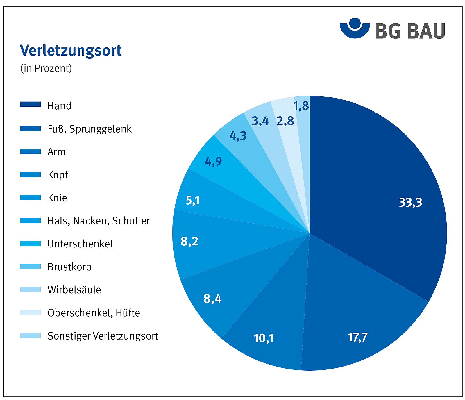 Im Jahr 2023 gab es auf Baustellen und im Bereich der baunahen Dienstleistungen in Deutschland insgesamt 96.153 meldepflichtige Arbeitsunfälle. Das sind 3.227 weniger als im Jahr 2022. Ein Drittel aller meldepflichtigen Arbeitsunfälle am Bau hat Verletzungen an den Händen zur Folge. Mit einem Anteil von 17,7 % folgen Verletzungen an Füßen oder Sprunggelenken, und rund 10 % der Verletzungen betreffen die Arme.