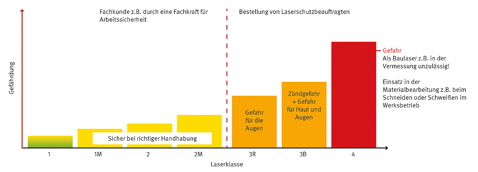Zur Vermeidung unnötiger Gefährdungen sollten im Bereich der Messlaser überwiegend grüne Laser mit max. Laserklasse 2 eingesetzt werden. Grüne Laser sind besser sichtbar als rote Laser und benötigen aus diesem Grund – jedenfalls für die meisten Anwendungen – keine augengefährliche hohe Leistung, wie z. B. in der Laserklasse 3R.