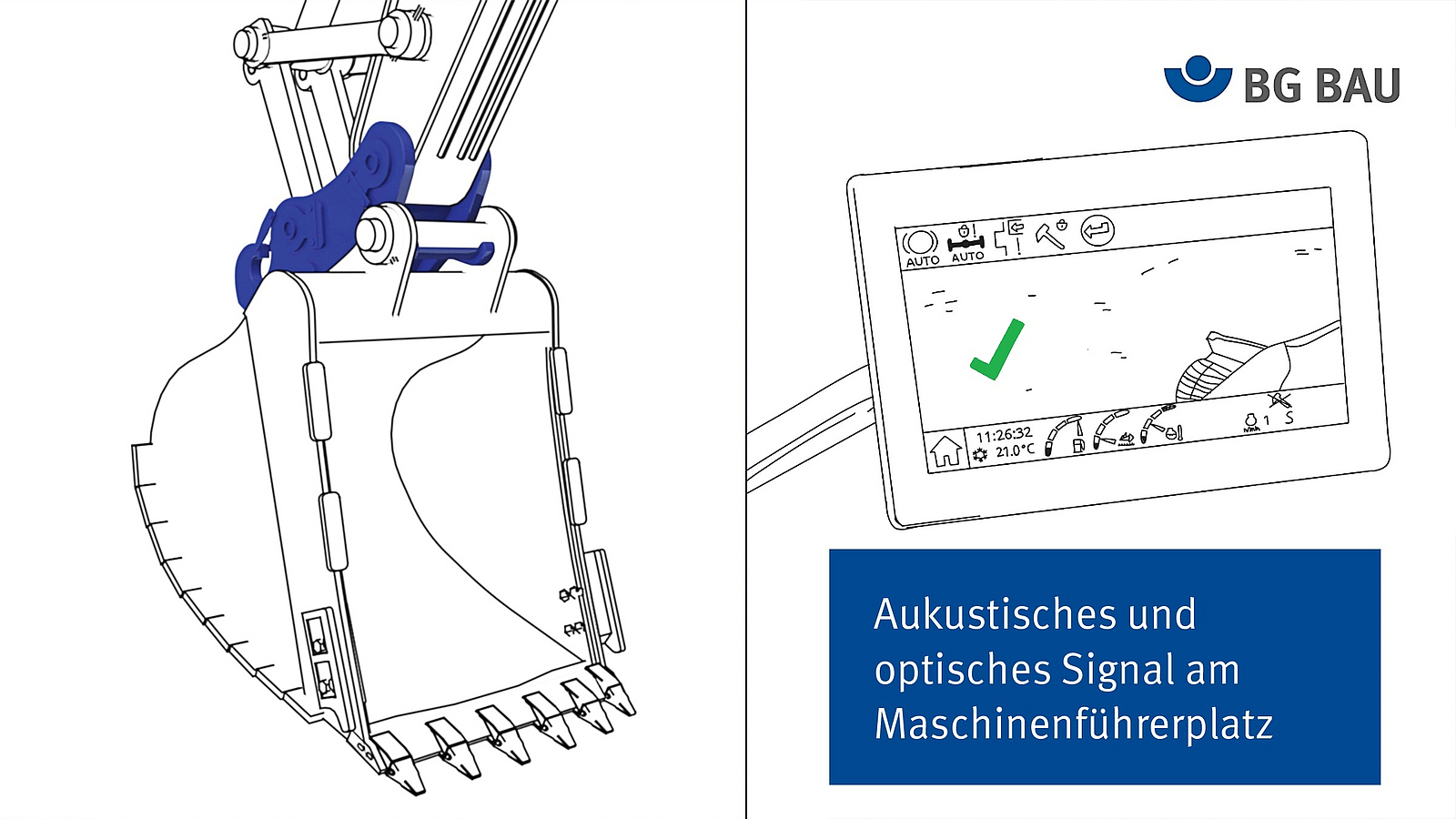 3. Eine Einrichtung, die ein akustisches und optisches Signal am Maschinenführerplatz aussendet, wenn die Arbeitsausrüstung nicht vollständig in ihrer Betriebsstellung angeschlossen ist. Die oben angeführten Anforderungen müssen immer mit einer Funktionsprüfung verifiziert werden. Die Prüfung muss mit den für den Einsatz vorgesehenen Arbeitsausrüstungen nach den Anweisungen des Maschinenherstellers erfolgen. In der Regel handelt es sich dabei um einen Gegendrucktest durch die Maschinenführenden.