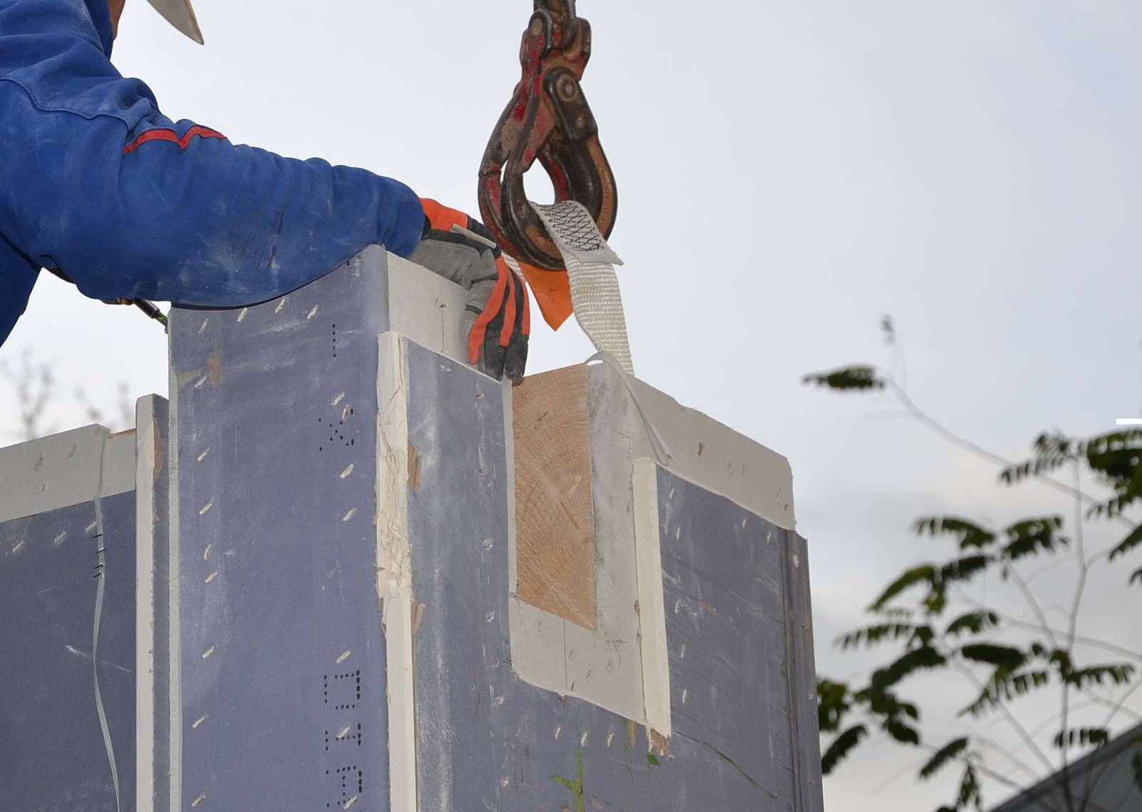 Auf der Baustelle werden regelmäßig große und schwere Holzbauelemente mit Hilfe eines Krans eingehoben. Um gefährliche Lastabstürze zu verhindern, müssen geeignete Lastaufnahmemittel verwendet und auf deren korrekten Einbau geachtet werden. Welche das im Einzelfall sind, ist über eine Gefährdungsbeurteilung zu ermitteln.