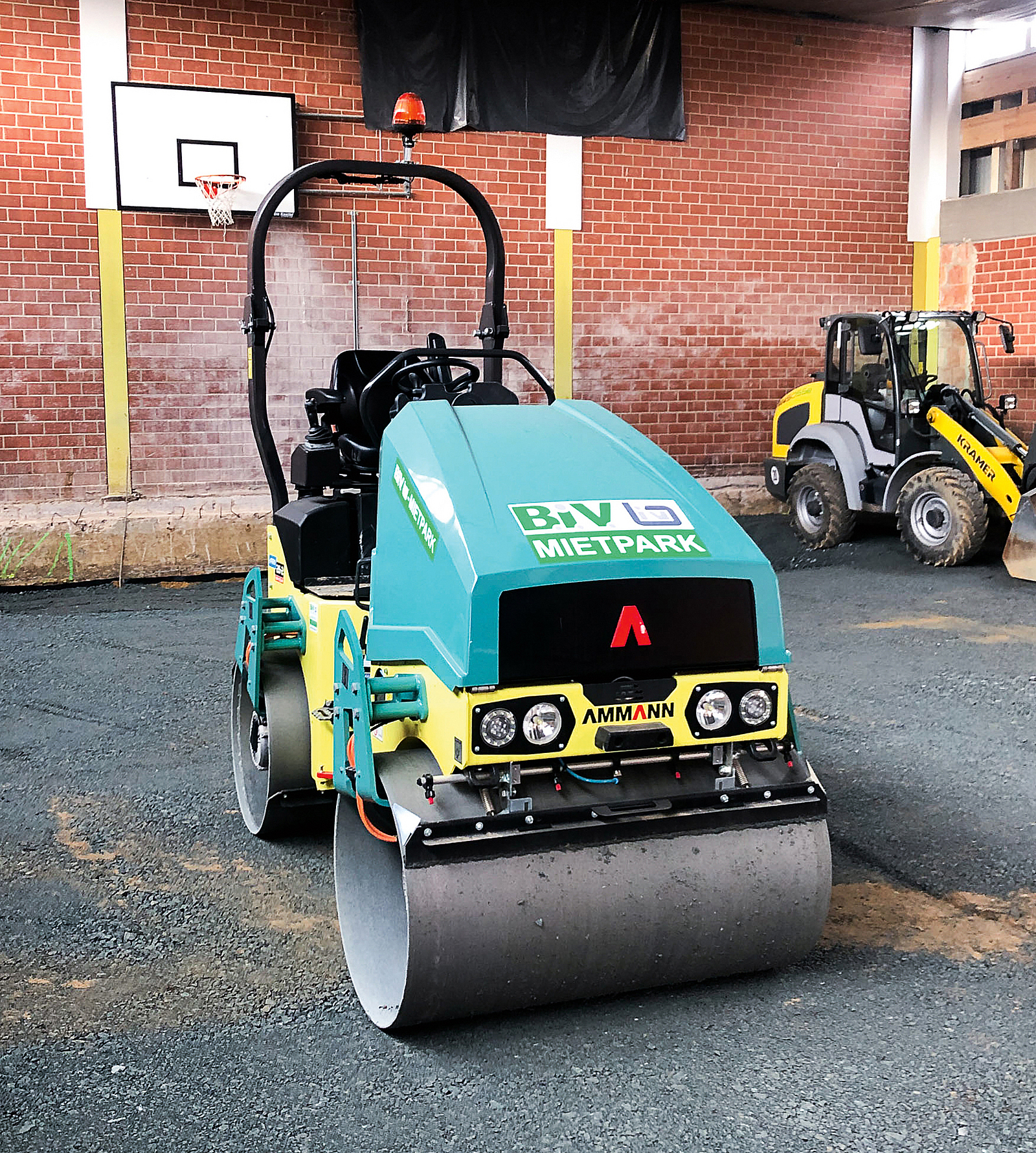 Die Erneuerung der Sporthalle umfasste: Beläge entfernen, Leitungen freilegen, den Boden ausbaggern – und dann alles wieder einbauen. Für die emissionsfreie Umsetzung des Bauvorhabens mietete die D&Z Bauunternehmung bei der B.i.V. eine batteriebetriebene Tandemwalze an, weil sie in ihrem Maschinenpark über keine elektrischen Baumaschinen verfügt.