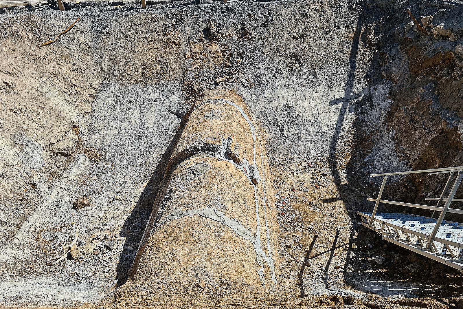 Damit die Rohre in die Dole eingebaut werden können, wird der Altkanal aufgeschnitten und die Stampfbetonhaube zunächst zwischengelagert.