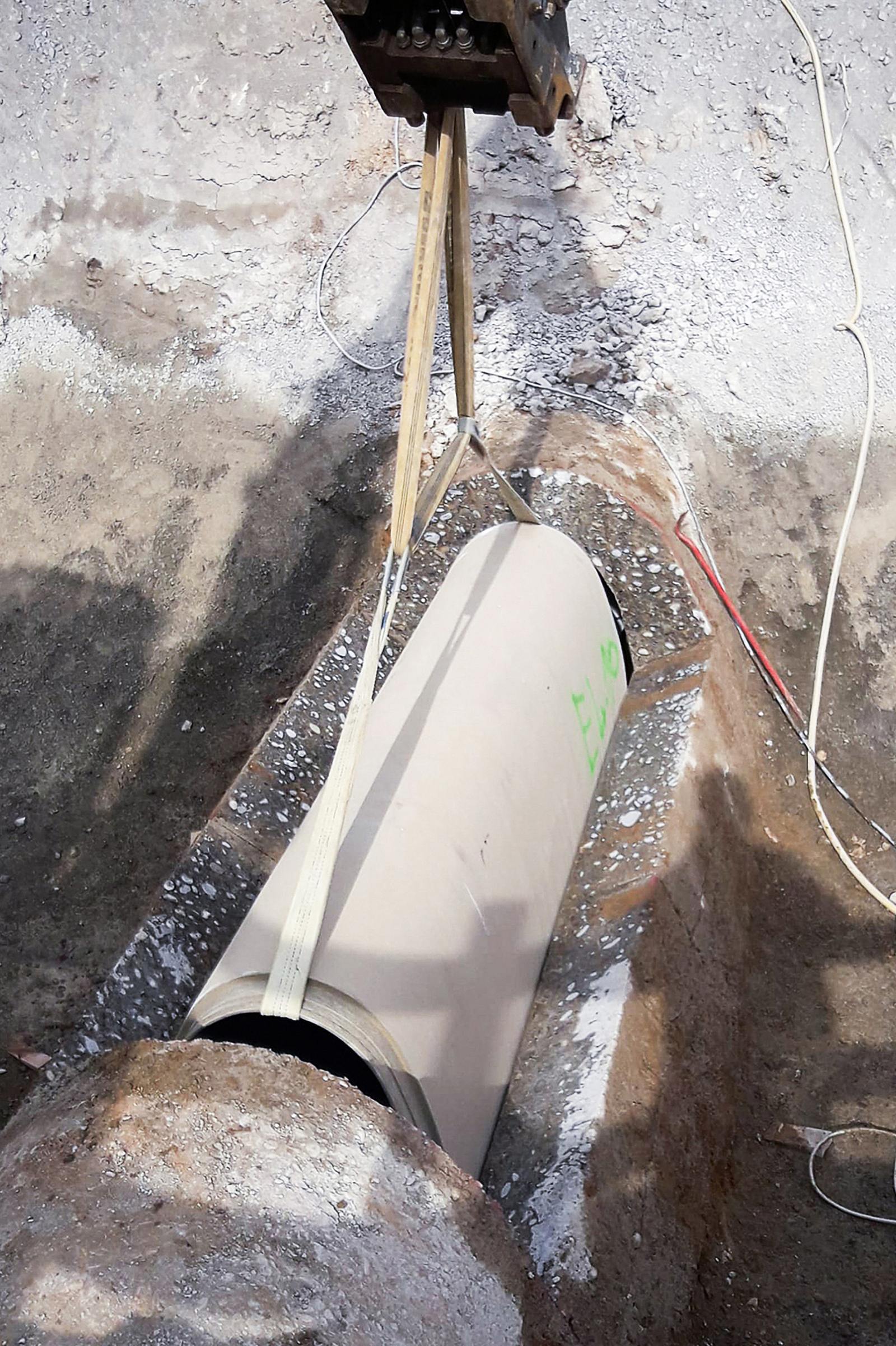Die maßgerechten Rohre werden durch die aufgeschnittene Dole auf den Rohrwagen abgelassen und zum Einbauort gefahren.